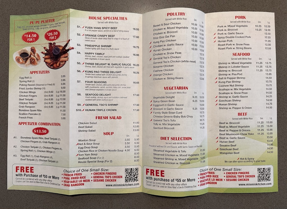 Welcome to Min Min KITCHEN, a delightful gem nestled in South Hadley, MA. This take-out only restaurant has quickly established itself as a favorite among locals, thanks to its commitment to freshness and quality. The standout dishes include shrimp lo mein and the ever-popular General Tso's chicken. Patrons rave about the rich flavors and satisfying portions, often enough for multiple meals.